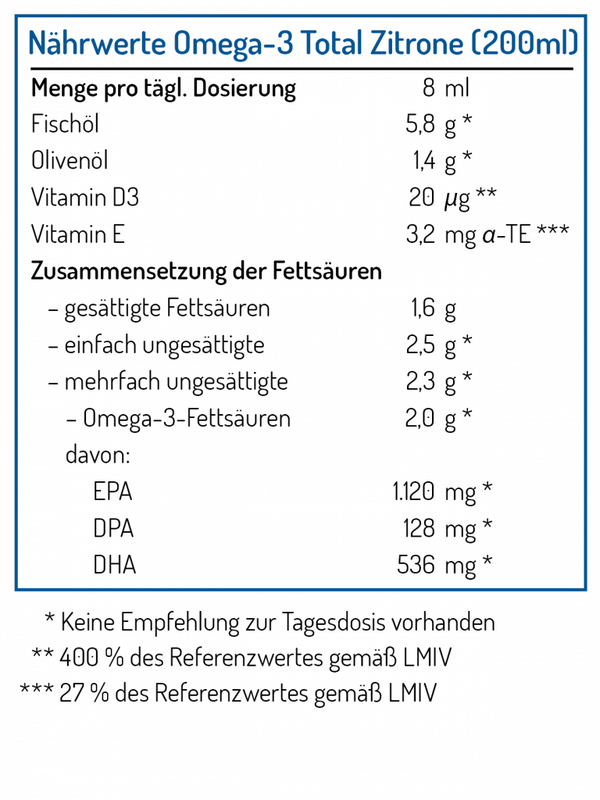 - 2.000 mg Omega-3 pro Tagesdosis (1 Esslöffel)