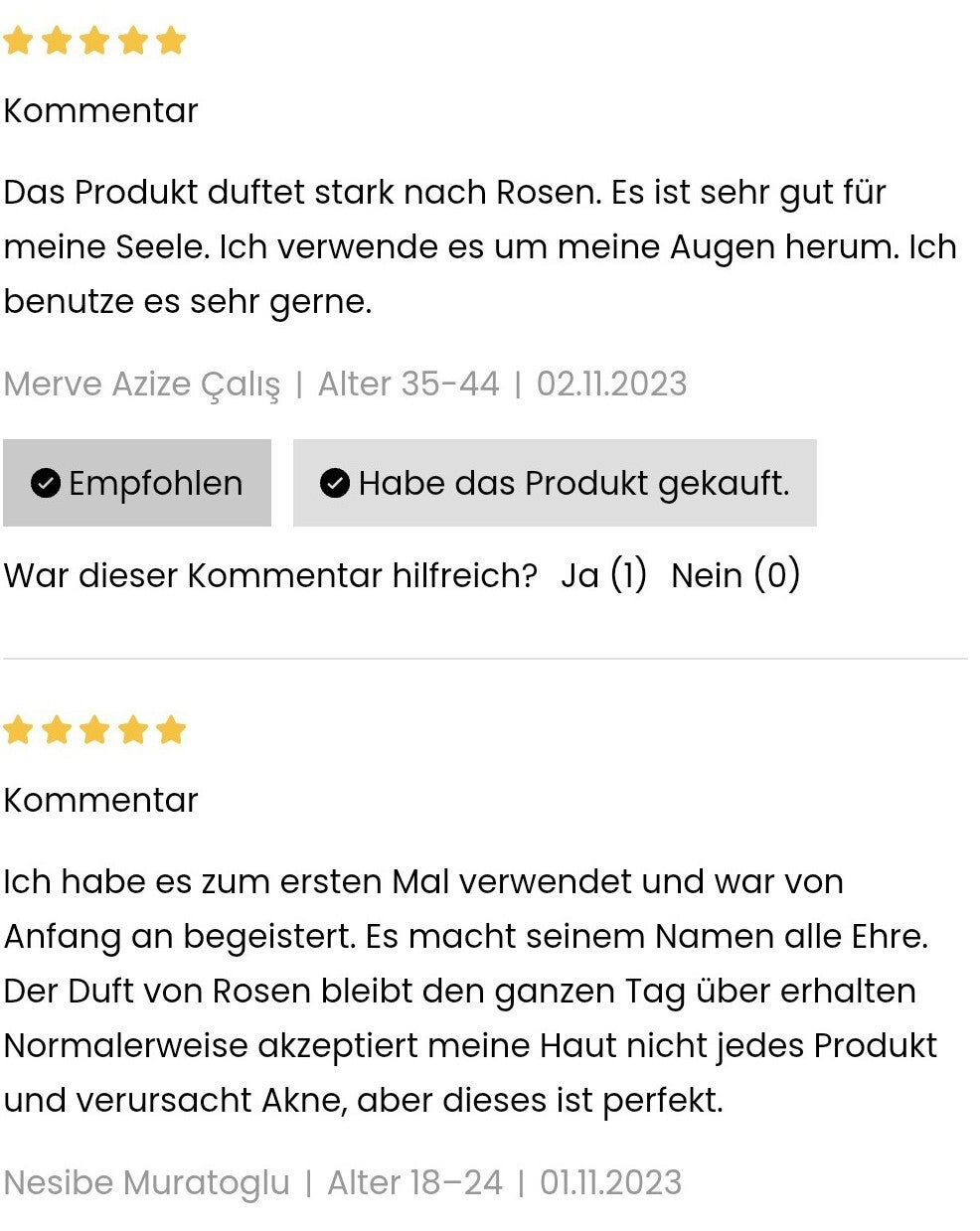 Das als Gold unter den Pflanzen angesehene Rosenöl verleiht Ihrer Haut ihren einzigartigen Duft der türkischen Isparta Rosen.